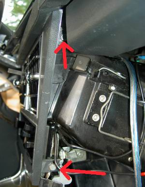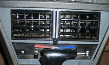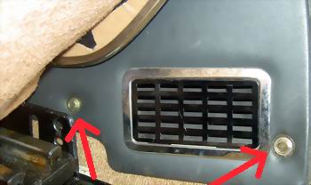 Die linke Lederverkleidung ist zusätzlich mit einer Schraube in der Mittelkonsole befestigt. Wenn man die Zusatzinstrumente abnimmt (Öltemperatur, Benzinanzeige), kommt man an diese sehr gut ran (siehe Werkstatthandbuch). Die Zusatzinstrumente muss man eh abbauen und es sind nur drei Schrauben. Nach dem Abschrauben der Lederverkleidungen muss man diese übrigens nicht komplett entfernen, es reicht, sie zur Seite und nach unten zu schieben. Schon erhält man einen seitlichen Ausblick auf die Belüftungsanlage. Doch damit ist man noch nicht am Ziel, zuerst gilt es, die Metallverkleidung der Lüftung abzunehmen. Diese wird durch vier seitliche Schrauben gehalten: