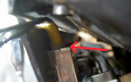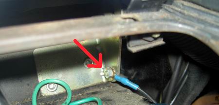 Die Lampe ist aus ihrer Fassung, jetzt muss man nur noch die Kabel trennen. Auch das ist schwieriger, als gedacht: Das rote Pluskabel ist einfach durch einen Stecker gesichert und kann abgesteckt werden. Doch das Massekabel ist unter den Mittelarmaturen (die man ja eh schon abgeschraubt hat) an ein Halteblech mit einer Mutter verschraubt.