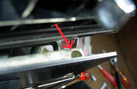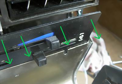 Die obere rechte Schraube (Bild oben) ist dabei etwas schwerer zugänglich, aber mit passendem Werkzeug auch problemlos entfernbar. Hat man die Metallblende komplett abgenommen, wird die Belüftungssteuerung gelockert. Sie wird durch zwei, ebenfalls seitlich gut erreichbare, Schrauben befestigt.