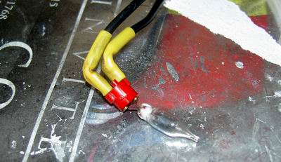 An den Minus-Pol löten wir den langen schwarzen Draht, an den Plus-Pol den kürzeren, mit dem roten Stecker. Danach biegen wir die Anschlussdrähte um ca. 45° und sichern die Lötungen vor einem Kurzschluss mit ein wenig Heißkleber.