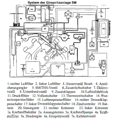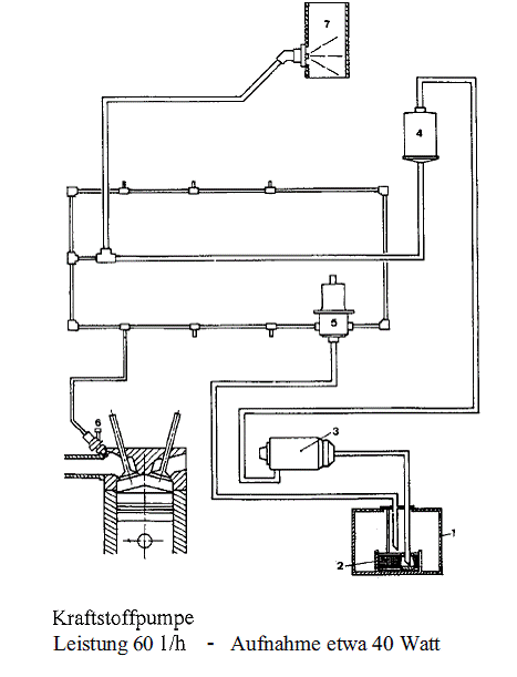 Der durch eine Elektropumpe (3) vorn Kraftstoff tank (1) angesaugte Kraftstoff läuft durch einen Vorfilter (2) und wird dann durch die Pumpe über den Feinfilter (4) zu der Ringleitung befördert, welche die Einspritzventile (6) und Kaltstartventil (7) versorgt.