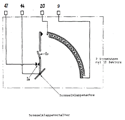 Der Drosselklappenschalter ist ein schwarzer Kasten, der an das Drosselklappengehäuse angebaut ist und eine elektrische Leitung besitzt. Eine mit der Drosselklappe verbundene Welle ist mit einem Stromabnehmer versehen. Zwei in der Mitte der Welle konzentrisch liegende Kontaktstücke sind an die Klemmen 20 und 9 angeschlossen. Der Stromabnehmer der Nadel kann die Klemme 14 mit den Klemmen 20 oder 9 in Kontakt bringen, je nachdem, an welchem Sektor der Stromabnehmer Kontakt hat. Dieser Kontakt ist jedoch nur in einer Drehrichtung (Beschleunigen) möglich, da sich ein Schalter IR öffnet, sobald sich die Drosselklappe schließt.