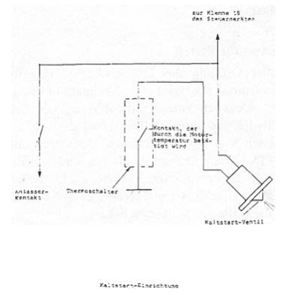 Beim Starten des kalten Motors wird das Gemisch über ein Kaltstartventil angereichert. Das Kaltstartventil wird von einem Thermozeitschalter gesteuert und nicht vom Steuergerät.