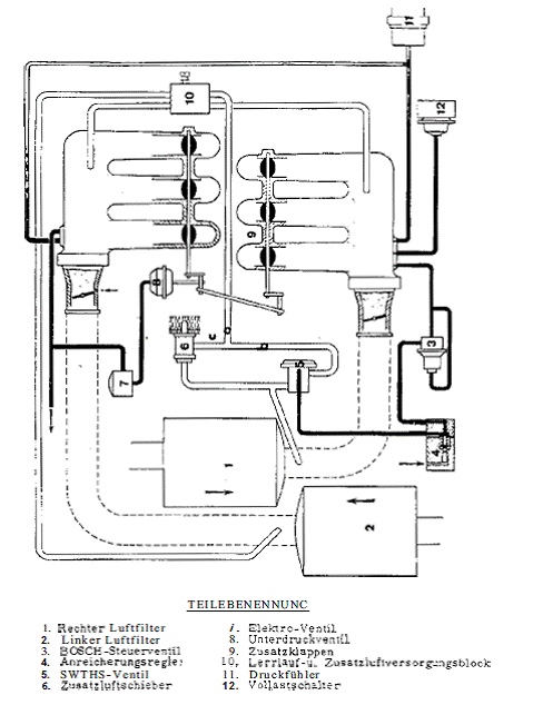 - Eine normale Leerlauf-Luftleitung ist im Luftzufuhrblock eingebaut. Die Luftmenge wird mit einer Stellschraube von Hand bei betriebswarmen Motor eingestellt. Ein Zusatzluftschieber öffnet bei kaltem Motor eine zusätzliche Luftleitung. Ein Temperaturanstieg vermindert die Luftzufuhr.