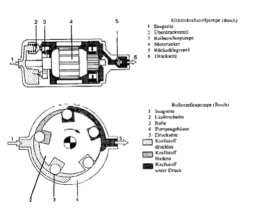 Elektrische Pumpe mit Rollen; sie besitzt einen Eingang (vom Kraftstofftank her) und einen Ausgang. Das Pumpensystem besitzt eine zylindrische Kammer, in der sich eine aus der Mitte versetzte Scheibe dreht. Die Scheibe hat am Rand 5 taschenförmige Aussparungen, in denen sich jeweils eine Rolle befindet. Unter Einwirkung der Fliehkraft werden die Rollen gegen die Wand der zylindrischen Kammer gepresst.