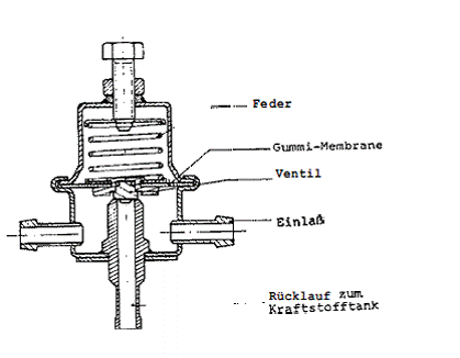 Der Druckregler besteht im Wesentlichen aus einer federbelasteten Membrane, die ein Ventil betätigt. Wenn der Kraftstoffdruck ausreicht, die Membrane anzuheben und das Ventil zu öffnen (Druck der Feder), fließt der überschüssige Kraftstoff durch die Rücklaufleitung zum Tank zurück.