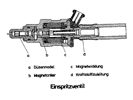 Die vom Steuergerät kommenden Stromimpulse bauen ein Magnetfeld auf. Dadurch wird der Anker angezogen und hebt die Düsennadel von ihrem Sitz ab; dabei wird der Weg für den unter Druck stehenden Kraftstoff frei. Die Ansprechzeit beträgt etwa 0,001 s der Ankerhub etwa 0,15 mm und die Öffnungsdauer der Einspritzventile je nach erforderlicher Kraftstoffmenge 0,002 s bis 0,01 s.
