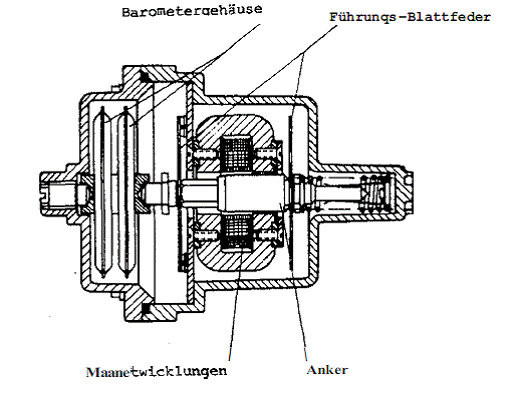 Der Druckfühler wandelt die Werte des Ansaugdruckes mit Hilfe eines beweglichen metallischen Kernes, einem sog. Anker, in elektrische Werte um. Die Informationen, die er an das Steuergerät schickt, werden zu einem Kommando verarbeitet, welches die Öffnungsdauer der Einspritzventile bestimmt. Ein spezieller Anker wird durch zwei Barometergehäuse betätigt, mit denen er verbunden ist. Indem der Anker mehr oder weniger in ein Magnetfeld eintritt, bestimmt er auf diese Weise die verschiedenen Werte der "Erregung" der Haupt- und Nebenwicklung. Dieser bewegliche Anker wird ohne Reibung von zwei Blattfedern geführt.