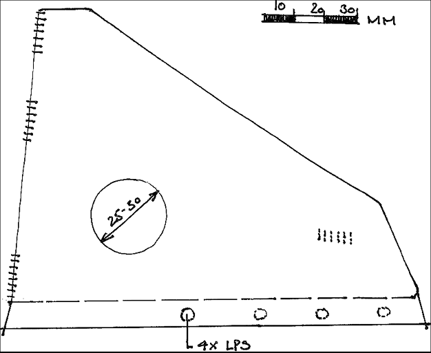 In 2000/2001 habe ich bei meinem Einspritzer die zweite Restaurierung gemacht, bedingt durch die erkannte Beschädigung und Verzug des Frontrahmens durch einen Unfall des zweiten Besitzers des SM. Der Unfall wurde mir beim Kauf zwar mitgeteilt, aber die Schwere des Schadens stellte sich erst später heraus, da immer der rechte Hinterreifen asymmetrisch ablief. Zudem schüttelte die ganze Karosserie wie bei einem ausgeleierten Cabrio, obwohl die SM Karosserie mir an sich von anderen SM als sehr steif bekannt war. Das äußerte sich auch in fühlbaren Bewegungen am oberen Ende der Frontscheibe bei Fahrt, wenn ich über Unebenheiten fuhr und aus dem offenen Seitenfenster die Hand an die oberen Frontscheibenecken legte. Der Rahmen wurde dann auch gerichtet, darüber habe ich in einer früheren Ausgabe dieses Blattes berichtet. Ziel der Restaurierung war ein gerader Rahmen, und vor allem eine voll ausgesteifte Karosse. Dass natürlich so nebenher alles galvanisiert wurde, und der Motorraum weiß lackiert wurde, versteht sich von selbst. Wie ich das Foto für diesen Bericht gesucht habe, sind mir die ganzen Restaurierungsfotos wieder in die Hände gekommen, das ist echt herrlich, die ganze mechanische Pracht frisch und besser als neu zusammengeschraubt zu sehen. Leider verdreckt trotz aller Bemühungen das Ganze danach wieder recht schnell. Ich habe nach dem Richten des Rahmens im gesamten Frontbereich alle Schweißpunkte noch mal anbohren und nachschweißen lassen, da sowohl die Verformungen eines Unfalles als auch die Rückverformungen einer Reparatur die Schweißnähte und Punkte stark belasten, ermüden und ausleiern. Aber ich wollte zur Sicherheit noch tun was möglich und sinnvoll war, aber so, dass es nicht in Erscheinung tritt. Da fiel mir an der Spritzwand, nach dem Abnehmen der Alu- Schallschutzbleche, der Schacht auf, der an den seitlichen oberen Enden der Spritzwand hinter die A-Säule führt. Unten kommt der Rahmen aus der Spritzwand, oben drüber hängt ziemlich frei die Rinne unter der Frontscheibe. Eine Lastüberbrückung findet hier nicht statt - und die A-Säule am SM ist eh’ ein filigranes Teil, das durchaus eine Verstärkung brauchen kann, zumal sie ja auch gerne gerade am unteren Ende unterm Windlaufchrom, sorry EDELSTAHL, rostet. Da ich zwar keine Statiken rechnen kann, und die für Autos schon gar nicht, habe ich einfach praktisch-statische Überlegungen angestellt und versucht, mir den Kräfteverlauf an der Stelle zu erschließen. Damit habe ich ein Versteifungsblech entwickelt, welches man gemäß der hier dargestellten Zeichnung ohne große Zusatzkosten bei einer Restaurierung einbauen kann. Eine durchgerostete A-Säule ersetzt das Blech aber nicht, der ganze Rest der Karosse muss trotzdem fachgerecht gemacht sein, das Blech ist nur eine Zusatzmaßnahme. Ich habe es mir anfertigen lassen aus 1,5 mm dickem Stahlblech und gleich einbauen lassen. Sinnvollerweise fertigt man sich vorab eine einfache Kartonschablone und passt diese genau ein. Das Loch im Blech dient dazu, den nun neu entstandenen Hohlraum - der SM hat ja nicht so viele - für Kontrollen und Behandlungen mit Lack und Hohlraumversiegelung zugänglich zu halten. Vor dem Lackieren sollte man die neuen Falze und Schweißungen auch mit überlackierbarer Karosseriedichtmasse behandeln.