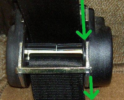 Es ist unbedingt darauf zu achten, dass die Achse beim Herausziehen des Gurtes nicht „abwickelt“, diese steht ja unter Federspannung. Daher unbedingt mit den Händen in Position halten und mit einem langen Gegenstand fixieren (siehe Bild):