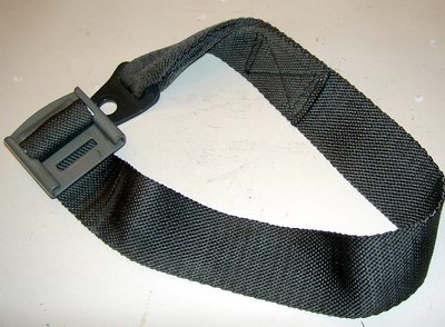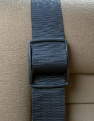 Er hat leider keinen Doppelschlitz, so dass er bei Nichtgebrauch senkrecht auf den Boden rutscht. Manche Gurtbänder haben für solche Fälle einen Gurtstopper als Plastikknopf im Gurtband. Wenn nicht, bieten sich Gurtstopper aus Edelstahl an, wie man sie z.B. auf Ebay finden kann: