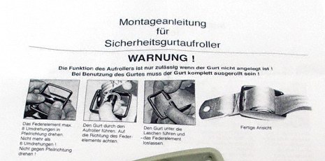 Es verbleibt noch die Gurtpeitsche: Diese schraubt man einfach ab und verschraubt stattdessen ein kurzes Gurtband mit Metallöse, das man in jedem Autozubehörhandel für kleines Geld bekommt.