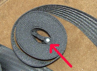 Man schiebt den Gurtstopper auf den Gurt, danach den verchromten Gurtstecker und danach den Umlenkbügel. Es ist darauf zu achten, dass die Komponenten zueinander alle richtig gedreht sind!