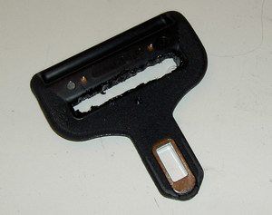 Dieser Stift ist deutlich dicker, als der Schlitz in der Achse der Aufrollmechanik, so dass der Gurt nicht heraus gezogen werden kann.