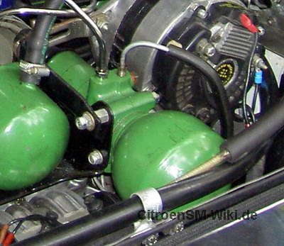 Die zahlreichen hydraulischen Aggregate des Citroen SM funktionieren mit einem Arbeitsdruck von durchschnittlich 150bar bis 160bar. Um einen derart hohen Druck über einen gewissen Zeitraum zu puffern, wurde im Kreislauf ein Hauptdruckspeicher mit entsprechendem Druckregler eingefügt. Beide Komponenten befinden sich gut zugänglich im vorderen Motorraum, direkt neben der Hydraulikpumpe.
