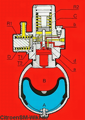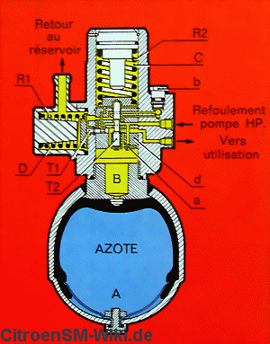 Nach einem gewissen Hydraulikölverbrauch der Aggregate (Lenkung, Federung, Bremsen) verringert sich der Druck in der Kammer B und ermöglicht die Rückkehr des Schiebers T1 in seine Ausgangsposition (F(R1) > F1).