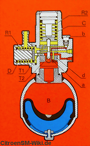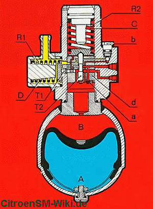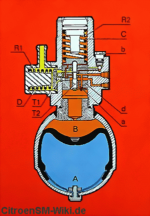 Der Druckregler besteht aus zwei Hydraulikschiebern (T1 / T2), einem Rückschlagventil (a) und drei Kammern (B, C und D). Das in der Membran gefüllte Gas ergibt die Kammer A.