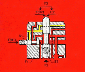 Sobald die Kraft F1 stärker wird als F(R1), bewegt sich der Schieber T1 und verbindet die Kammern C und D (F2=0). Es folgt F3 = F(R2) und F2 wird maßgeblich (F2 >F3). Nun öffnet sich der Schieber T2 und die Druckförderung wird ausgeschaltet.