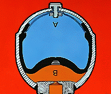 Öffnet man bei laufendem Motor die Druckablassschraube, so wird kein Hydraulikdruck im Druckspeicher aufgebaut. Die mit 65bar Tarierdruck gefüllte Membran füllt die gesamte Kugel aus (blau im Bild). In den Kammern B, C und D herrscht normaler atmosphärischer Druck und das Rückschlagventil a ist geöffnet. |