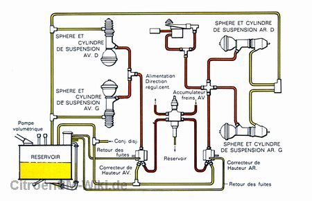 Der notwendige Öldruck kommt vom zentralen Hydraulikkreislauf, wie oben beschrieben. Angesaugt vom Hauptfass per LHM-Pumpe wird das Hydrauliköl auf die jeweiligen Federzylinder und -Kugeln verteilt.