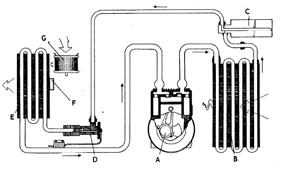 Grundsätzlich arbeitet eine Klimaanlage wie der vom Haushalt bekannte Kühlschrank nach dem Prinzip der Wärmepumpe. Es wird keine Kälte produziert, sondern Wärme aus dem Fahrzeuginnenraum nach außen befördert. Dazu bedient man sich des speziellen Kältemittels R12 (Dichlorf luormethan CCL“F“)und der Kenntnis zweier Naturgesetze: Beim Verdampfen einer Flüssigkeit wird der Umgebung Wärme entzogen, beim Übergang vom dampfförmigen in den flüssigen Zustand wird Wärme frei. Soweit die Theorie. Die Klimaanlage besteht aus drei Hauptkomponenten: Kompressor, Kondensator und Verdampfer. Der Kompressor wird über die hintere Steuerkette, die Zwischenwelle und den Keilriemen vom Motor angetrieben. Der Kompressor (A) verdichtet das gasförmige Kältemittel. Es erhitzt sich unter einem Druck von 12 bis 25 Bar auf 60 bis 120°C und gelangt in diesem Zustand in den Kondensator (B) . Im Kondensator wird durch die vorbeiströmende Luft das Kühlmittel abgekühlt und verflüssigt (kondensiert). Anschließend gelangt das Kältemittel in den Entfeuchterbehälter (C), der als Vorratsbehälter dient und in dem Wasserreste absorbiert werden.