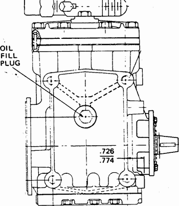 Dieses Öl sollte daher von Zeit zu Zeit überprüft und ggf. nachgefüllt werden. Dazu muss man einen Messstab (Oil Dip Stick) herstellen, der (wie in der Zeichnung zu sehen ist) durch das Schraubenloch (Oil Fill Plug) in den Kompressor einzuführen ist. Das nachzufüllende Öl ist bei jedem Bosch-Dienst mit Abteilung für Klimaanlagen erhältlich.