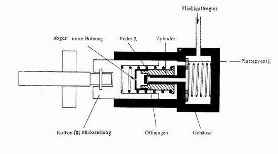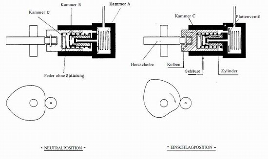 Wenn man das Lenkrad einschlägt schiebt die Herzscheibe den Kolben in das Gehäuse und ein Teil der Flüssigkeit der Kammer C entweicht durch das Plattenventil zum F liehkraft r egle r . Der Kolben nimmt auf seinem Weg die Feder und den Zylinder mit sich, bis der Zylinder am Gehäuse in Anschlag kommt. Der Druck, der auf den Kolben einwirkt, ist stets der vom Fliehkraftregler abgegebene Druck.