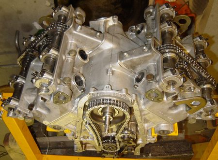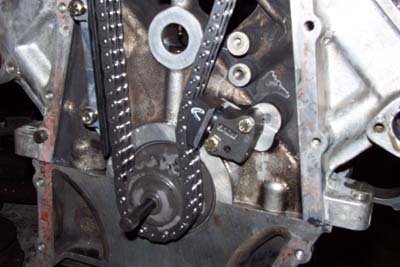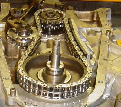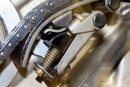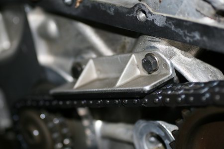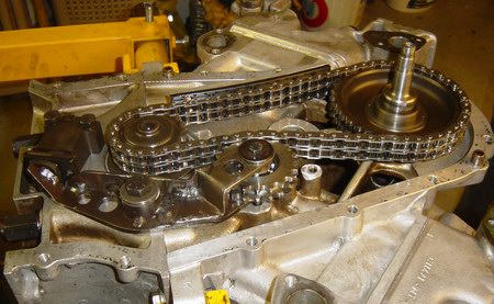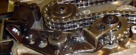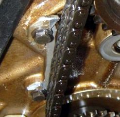 Obiges Foto zeigt den DS-Spanner im Maserati-Motor: Die Lösung wirkt wesentlich kompakter, als die mit Zahnrädern. Dies sind nur zwei Beispiele, es gibt noch andere Lösungen als hydraulische Kettenspanner. Welche Lösung die beste ist, ist nicht unumstritten. Auch gibt es die These, dass der mechansiche Spanner zweiter Generation in Verbindung mit einer neuen Qualitäts-Kette ebenfalls eine hervorragende Lösung darstellt. Eine weitere Problemzone der Primärkette ist der dem Spanner gegenüber liegende Anschlagsbegrenzer. Auch er ist im Original recht schwach dimensioniert und kann im Laufe der Zeit Abnutzungen aufweisen und sogar brechen.