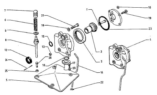 Das liegt häufig an dem nach der Revision nicht überprüften Öldruck. Dies ist jedoch dringend notwendig, da das den Motor vor zu hohen Drücken bei kaltem Öl schützende Bypassventil in der Ölpumpe auch einem Alterungsprozess unterliegt. Das hier alternde Teil ist die Vorspannfeder (6), welche mit den Jahren etwas erlahmt. Durch zu niedrige Spannung der Feder öffnet das Ventil bei einem zu niedrigen Druck, wodurch der Öldruck bei einem Wert von unter 5,5 bar bei 6000U/min und 110°C Öltemperatur bleibt.