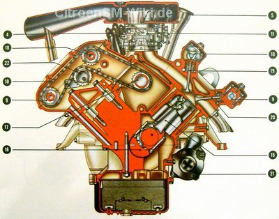 Experten wundern sich über den 90° Winkel der Zylinderköpfe, was sonst eher bei 8-Zylindern üblich ist und im Falle des C114 Motor einen rauhen Lauf verursacht. Dieser Kompromiss wurde zu Gunsten einer möglichst kompakten Bauweise eingegangen, denn im Motorraum des SM ist aufgrund der vielen Hydraulikaggregrate nur wenig Platz. Diese werden allesamt durch eine Zwischenwelle angetrieben:
