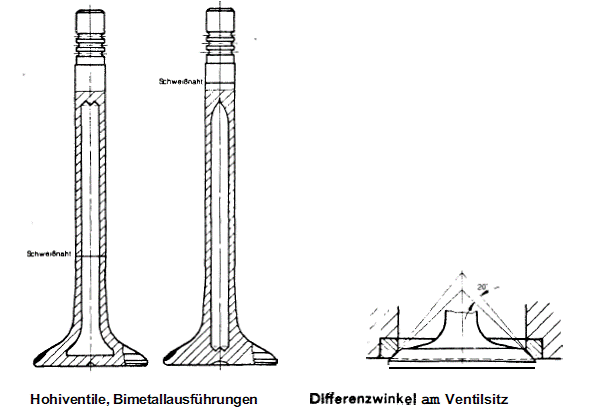 Auslassventile Die thermisch und chemisch sehr stark beanspruchten Auslassventile erreichen Temperaturen bis zu 1000°C . Da sich normaler Auslassventil-Werkstoff bei diesen Temperaturen verformt, werden Hohlventile verwendet, in welchen eine Natriumfüllung eingebracht ist. Der Hohlraum wird zu etwa 60% des Volumens mit metallischem Natrium gefüllt, das bei 97°C schmilzt und die Wärme vom Teller zum Schaft ableitet. Die Temperatur am Ventilkopf wird dadurch um etwa 80°C bis 120 °C verringert. Das Auslassventil hat einen Durchmesser von 8/85mm. Der Fräswinkel beträgt ebenso 90 (45) Grad, bei einer Breite der Ventilsitzauflage von maximal 2,2mm. Es empfiehlt sich, zwischen Ventilsitz und Sitzring einen Differenzwinkel vorzusehen,, den man so legt, dass die dem Verbrennungsraum zugekehrte Seite durch eine anfängliche Linienberührung abdichtet und den Verbrennungsgasen keinen Durchtritt gestattet. Achtung : Verbrauchte Hohlventile mit Natriumfüllung dürfen nicht ohne weiteres verschrottet werden (heftige Reaktion mit Wasser).