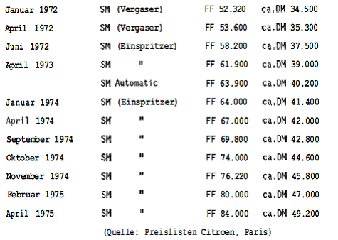 Der Citroen SM war nicht nur das modernste und eines der schönsten Autos seiner Zeit, sondern (leider) auch eines der teuersten. Wie sich die Preise während seiner Bauzeit entwickelt haben, zeigt die folgende Preiliste. Man beachte, dass damals das Geld mehr Wert war, als heute. Inflationsbereinigt wäre der SM auch heute noch in der absoluten Preis-Spitzenklasse.