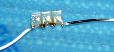 Wir löten sie zusammen und schneiden anschließend alle Beine mit einem Seitenschneider sehr nahe am Leuchtkörper ab. Dann müssen noch zwei Drähte an die äußeren Enden gelötet werden und fertig ist unser Leuchtmodul: