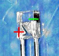 Jetzt müssen wir uns nur noch mit dem Einbau der LEDs in die Halter beschäftigen. Dazu stecken wir sie so von Innen in den Schlitz, dass sie genau passen und mit der Kante des Lichtleiters abschließen: Wichtig ist die Beachtung der Polung: Man muss die LEDs so rum einsetzten, dass der entsprechende Minusdraht an dem Metallnippel gemäß der Schaltung oben liegt.