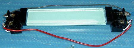 Schon hat man einen Ausblick auf die Beleuchtung des Radios: In zwei Plastikfassungen steckt ein Lichtleiter. Er besteht einfach aus einem Plexiglasstreifen, der auf einer Seite mit heller Farbe matt lackiert ist. Die matt lackierte Seite ist oben(!).