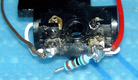 Jetzt müssen wir uns den richtigen elektrischen Einbau überlegen: Pro Halter drei Leuchtdioden macht insgesamt 6 Leuchtdioden. Bei 3V Betriebsspannung bräuchten sie in originaler Reihenschaltung nach Adam Riese 18V für einen ordentlichen Betrieb. Die haben wir aber nicht, weshalb wir also nicht mehr die beiden Leuchtquellen in Reihe schalten, sondern parallel. Damit haben wir 9V / 20mA pro Seite, was einen gemeinsamen Vorwiderstand von 75Ohm notwendig macht: R = UR / I = (12V – 9V) / (2*20mA) = 3V / 40 mA = 75Ω.