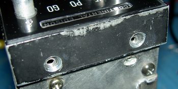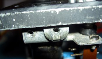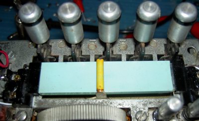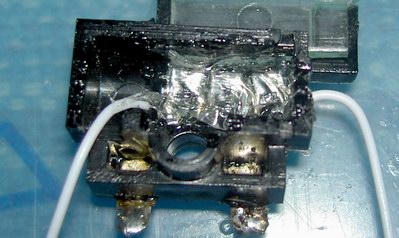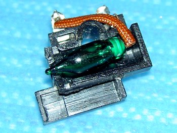 Die zwei schwarzen Plastikhalter sind jeweils mit einer Schraube fixiert. Nach dem Ablöten der Drähte (Vorsicht, das schwarze Plastik ist nicht temperaturfest!) kann man sie leicht ausbauen. In ihnen steckt jeweils eine kleine 6V – Glühlampe, in grün gefärbt: