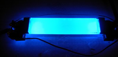 Nun empfiehlt es sich, einen Testlauf im „Trockenen“ zu machen: Dazu schließt man eine 12V Quelle an die zusammengesteckte Konstruktion an. Nun sieht man, ob alles überhaupt funktioniert und gleichmäßig hell ausgeleuchtet ist. In diesem Beispiel wurden blaue LEDs verwendet: