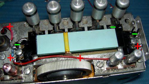 Der schwarze Verbindungsdraht zwischen den beiden „-“ Haltern bleibt gleich. An der „+“ Seite kommt ein weiterer Verbindungsdraht neu hinzu (rot). Der Pluspol des Radios wird an den 75Ohm Vorwiderstand angeschlossen.