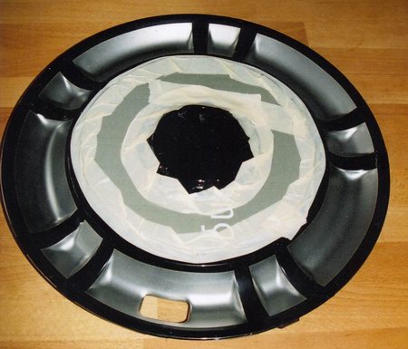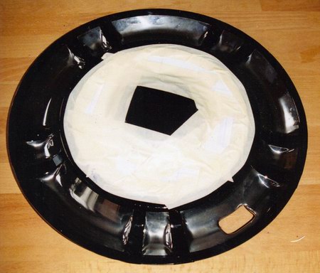 6) Weiteres Abkleben aller Teile der Radkappe, also der mattierten Stellen und der Rückseite, so dass nur noch der Lochring frei ist.
