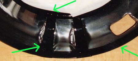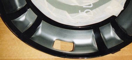 1. Der hintere Rand der Radkappe, der der Stabilität dient, ist meistens mehrfach nach innen gebogen, da unsensible Mitarbeiter von Reifendiensten oder hirnlose Vorbesitzer die Radkappen mit starken Schraubendrehern entfernen wollten, möglichst noch mit nicht entfernter Zentralschraube. Offensichtlich wissen nur Eingeweihte, dass man vorher seitlich hinter die Kappe schaut, um den Hebel an einer der verstärkten Aussparungen unter den Halteklammern ansetzt.
