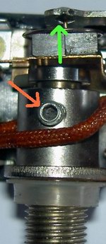 b) Der Überbrückungsschalter auf der Unterseite, der normalerweise nur durch den Pin des Drehschalters geschlossen werden soll, ist möglicherweise verbogen und überbrückt die Heizspirale dauerhaft: