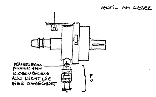 Der fertige Ventilsatz wird mit einer Dichtung in den Nehmerzylinder eingeschraubt und zwar so, dass der Spritzenstutzen gut erreichbar positioniert ist. Befüllen dann wie schon gesagt: Spritze mit Modelbauöl, Ventil auf, Öl hineinpressen, bis die Rillen im Nehmerzylinder am Rand des Glases stehen (Fahrzeug in Normalposition mit laufendem Motor!), dann Ventil fest zudrehen und fertig!
