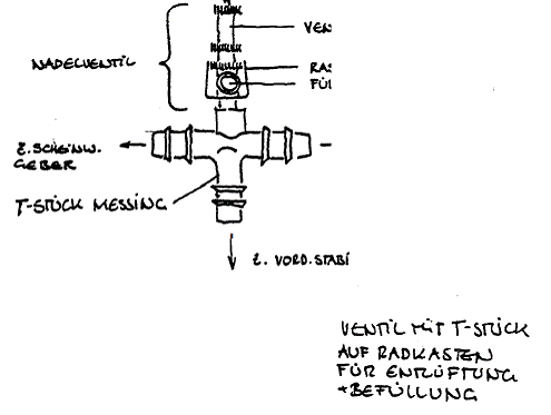 Der höchste Punkt des eingebauten Systems liegt am T-Stück auf dem vorderen rechten Radkasten, wo die drei Leitungen von hinterem Stabi, vorderem Stabi und Nehmerzylinder zusammentreffen. Da die Leitungen zu den Stabis nach unten gehen, sind sie meistens auch noch weitgehend voll, so dass leere Leitungen normalerweise nur im Bereich des Radkastens auftreten. Perfektionisten können hier folgendes noch zusätzlich machen: Sie bauen sich ein neues T-Stück mit einem weiteren Nadelventil, dies ist dann der höchste Punkt, an dem zusätzlich befüllt und entlüftet werden kann, womit das Gesamtsystem einstellbar wird ohne irgendein Teil auszubauen.