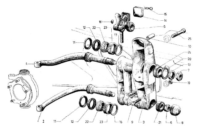 An der Vorderachse haben wir es auf jeder Seite mit je zwei Schwingarmen zu tun, die aus geschmiedetem Stahl bestehen und in einem gegossenen Alublock als Achsaufnahme sitzen (3). Die Lagerung der Schwingen erfolgt in Kegelrollenlagern, deren äußerer Lagerring in das Alugehäuse eingepresst ist. Die hinteren, hochbelasteten Lager sind geteilt, d.h. sie bestehen aus Innenteil und Rollenkäfig, die äußere Lagerschale ist separat und war früher auch einzeln käuflich.