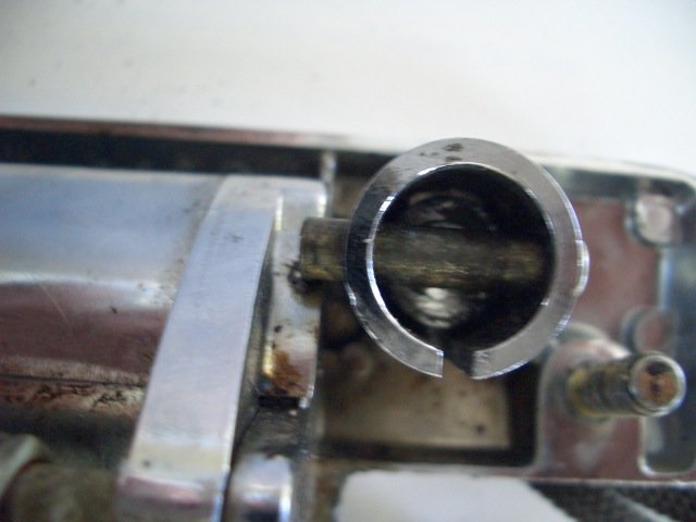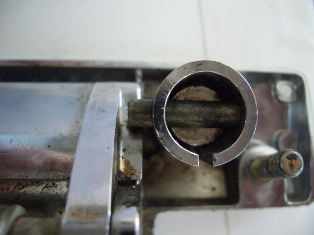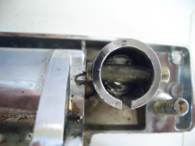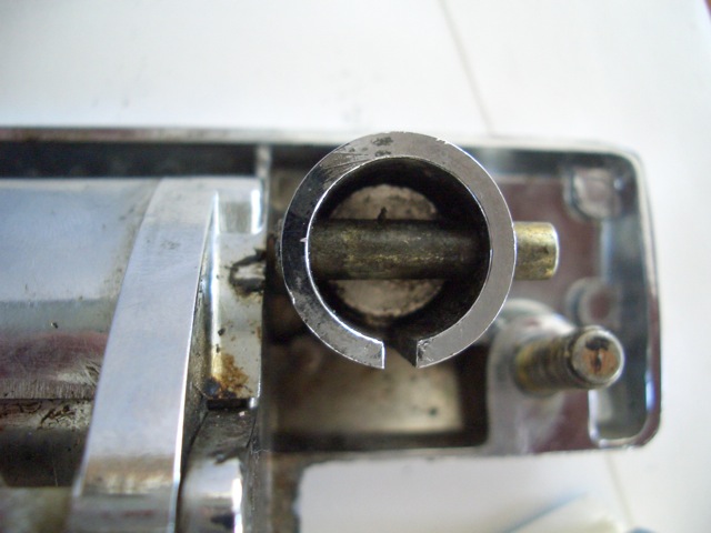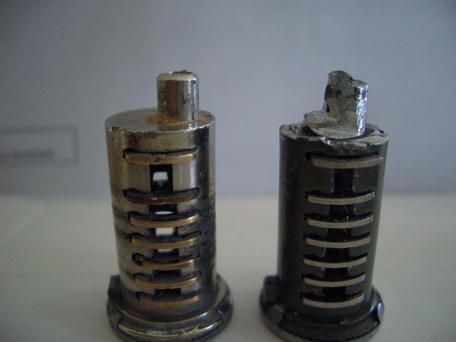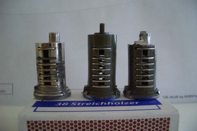 Funktion: Der Originalzylinder (links) bewegt den darüber gelegenen Sperrschieber durch den am Zylinderende exzentrisch gelegenen Nocken. Wenn man den Schlüssel so schräg wie auf dem Bild reinstecken kann, isser innen total hinüber!