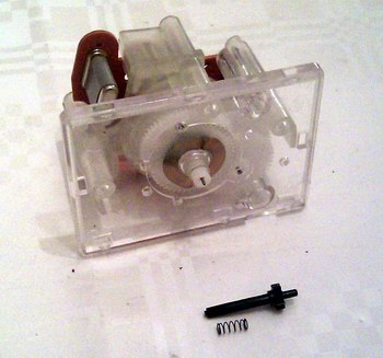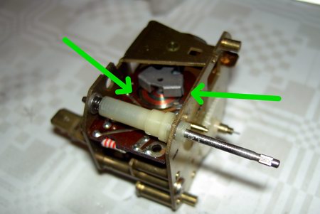 Die Achse der Quarzuhr ist aus Plastik und ohne die zugehörige Aufsteckkappe zu wackelig, als dass wir den originalen Plastikknopf aufsetzen könnten. Also müssen wir etwas mit Originalteilen basteln. Wir bauen die Metallachse des Originalwerks aus, indem wir sie aus dem Laufwerk ziehen: