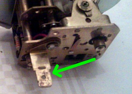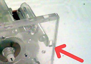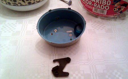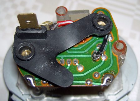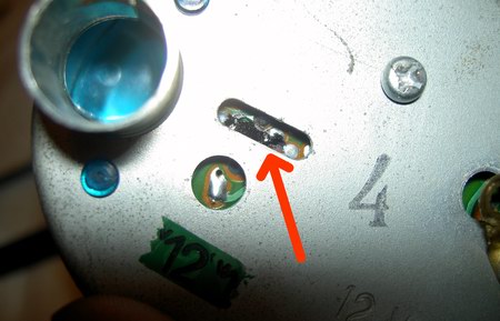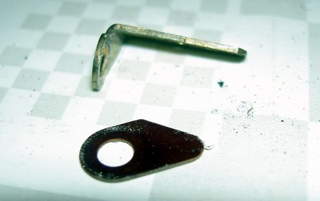 Zunächst bauen wir die Teile vom Originallaufwerk ab, die wir in der neuen Uhr wieder verwenden wollen. Als erstes wäre da die gewinkelte Lasche für die Stromzufuhr: