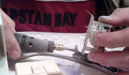 Das Ziffernblatt verwenden wir nun als Bohrschablone und bohren mit Hilfe des Dremels und eines kleinen Bohreinsatzes zwei winzig kleine Löcher in die Plexifront des neuen Uhrwerkes. Diese müssen so klein sein, dass man die originalen Halteschrauben vorsichtig hinein drehen kann. Nun drehen wir das Laufwerk auf seine Platinen-Rückseite und dremeln mit einem Schleifstein die überstehenden Plastik-Clipse soweit ab, bis sie auf einer Höhe mit den Schraubenfassungen liegen und nicht mehr überstehen: