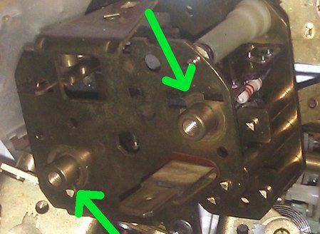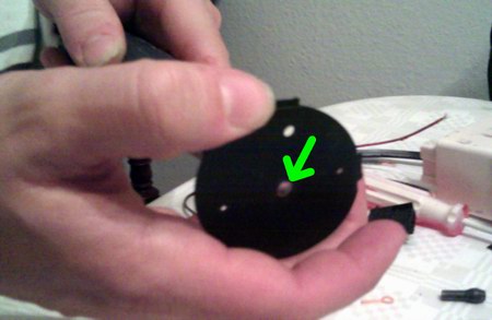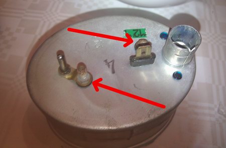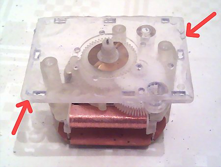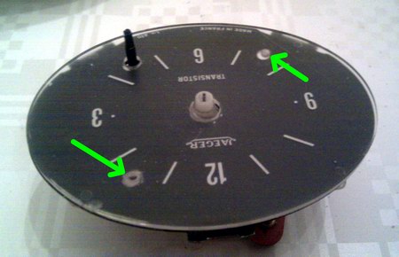Zu lösen sind die beiden mit Pfeil markierten Schrauben, danach kann man die gesamte Uhr samt Ziffernblatt nach vorne aus der Metalldose drücken (am besten hinten auf die Plus-Stromlasche drücken). Neben dem Gehäuse gilt es nun, die anderen Teile, die man für den weiteren Umbau benötigt, auszubauen: Ziffernblätter und Zeiger. Letztere zieht man vorsichtig(!!) einfach von der Achse ab.